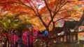 ・・・そうこうしているうちに三室山(標高80m)の麓に到着。真っ赤に紅葉したもみじの下、階段を上ります。これですこれです。