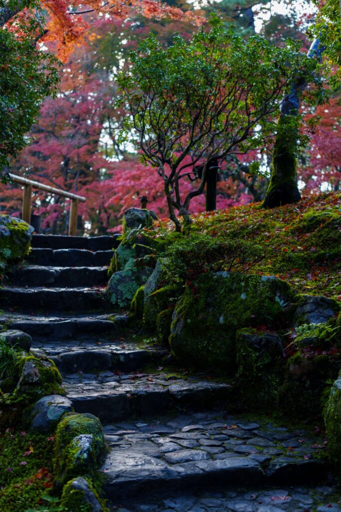 奥に進みますと、苔むした石段の向こうにも真っ赤なもみじが見えてまいりました。