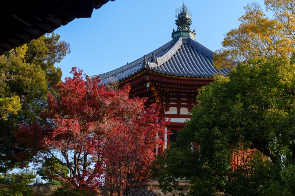 途中、南円堂の裏手が綺麗な秋の景色になっているのに目がとまります。ここは落ち着いた雰囲気でお気に入りのスポットです。