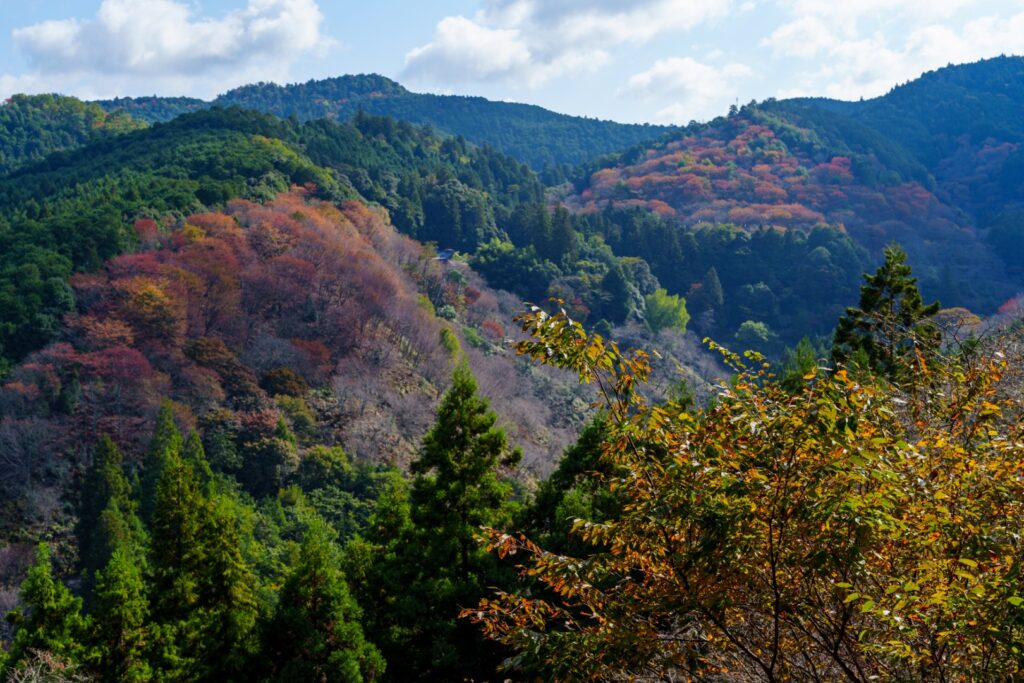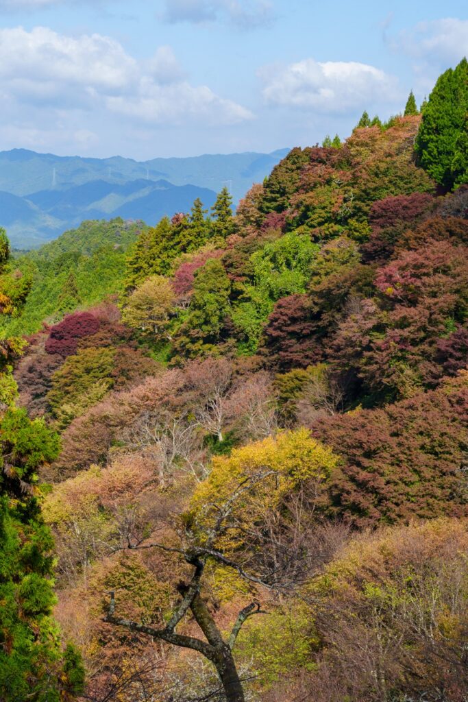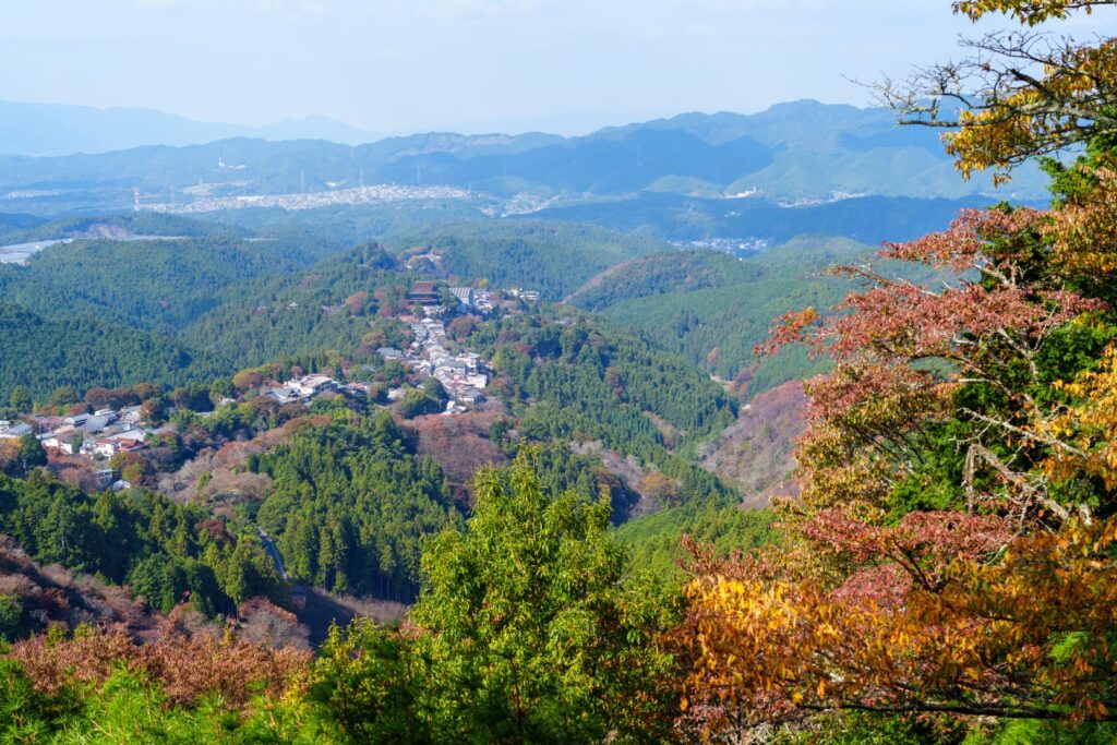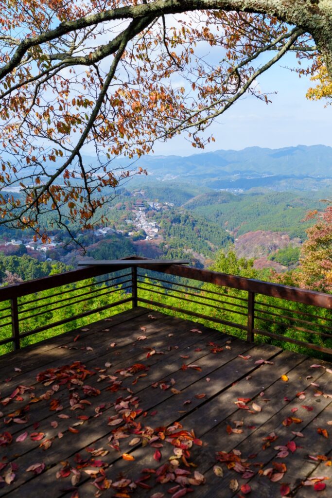 せっかくですので、展望台からもしっかり眺めておきましょう。手前にもみじ、奥には桜たちに囲まれた金峯山寺がしっかり見えますね。うーん、これこれ。前回春に来た時に下千本、一目千本、花矢倉。これらの景色が特にお気に入りで、それらの紅葉の景色を見ておきたかったんですよね。