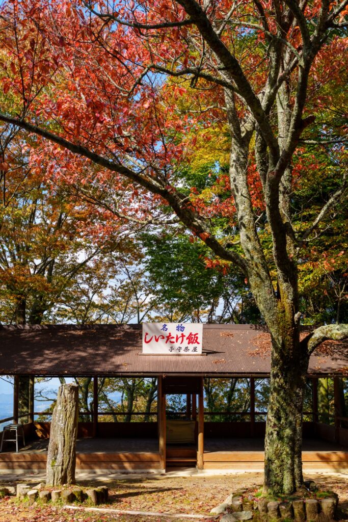 着きました。花矢倉展望台。綺麗な紅葉と、名物のしいたけ飯の赤がまぶしいです。